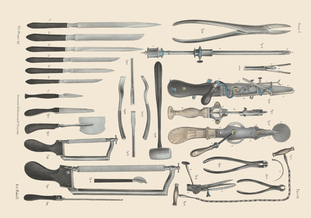 6. Serras cirúrgicas, facas e tesouras para operações no osso.