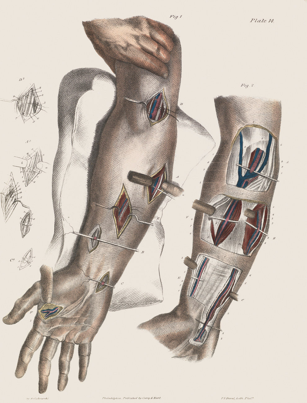 7. Anatomia da axila, e a ligadura (apertando por corda para parar o fluxo sanguíneo) de um vaso sanguíneo perto dele.