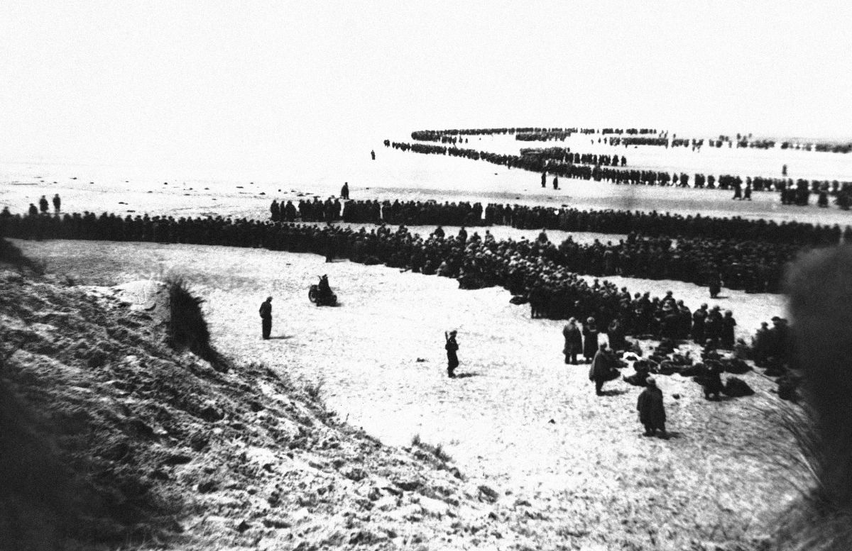 Milhares de tropas britânicas e francesas se aglomeraram na praia do porto de Channel, em Dunkirk, França, em 4 de junho de 1940, aguardando navios para devolvê-los à Inglaterra. Segundo relatos britânicos, 335.000 soldados aliados foram evacuados do bolso alemão guardado em Flandres, no que foi descrito como o maior recuo da história militar.